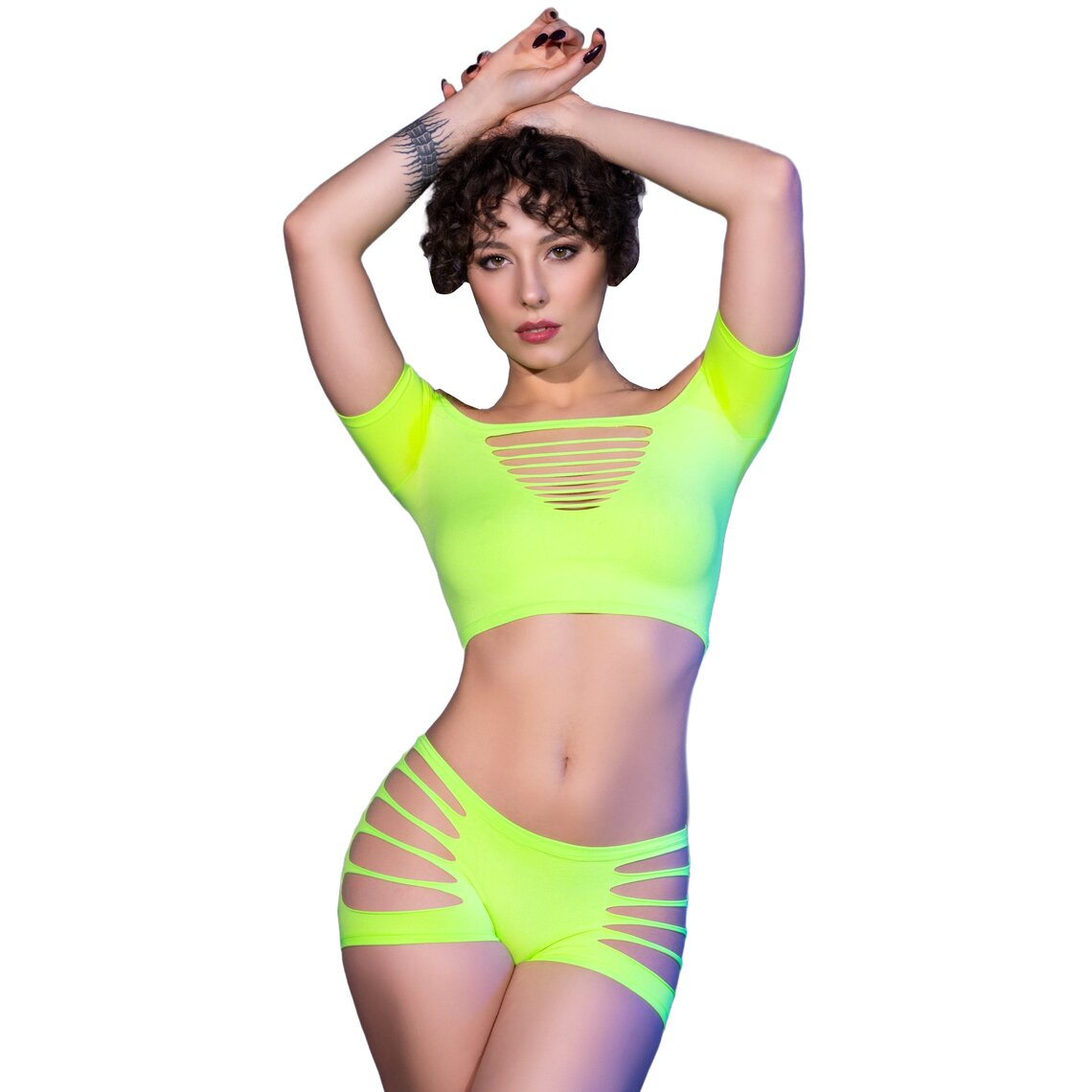 Erotic set for women: neon green top and shorts. Made from stretchy fabric.
