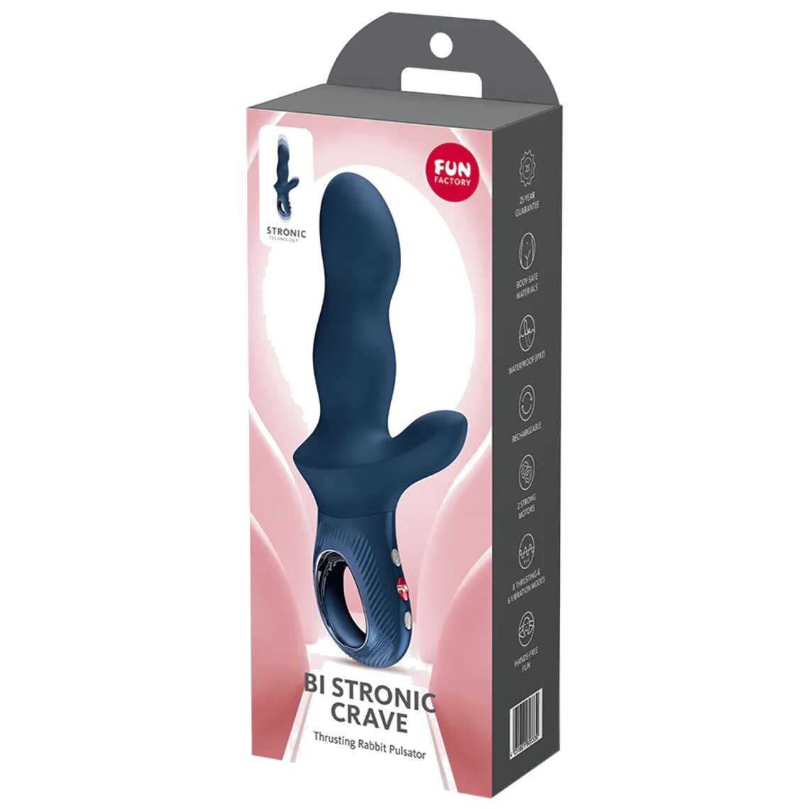 Whether solo or with a partner, the BI STRONIC CRAVE fits seamlessly into any fantasy and is crafted from body-friendly silicone for ultimate comfort. Its ergonomic LOOP handle featuring a textured, ribbed, non-slip surface gives you control when you want it, while the intuitive 3-button interface keeps things effortless. Want to take it up a notch? Always use a water-based lubricant for even deeper sensations. The BI STRONIC CRAVE comes with a 25-year FUN FACTORY warranty, guaranteeing exceptional quality, durability, and endless enjoyment.