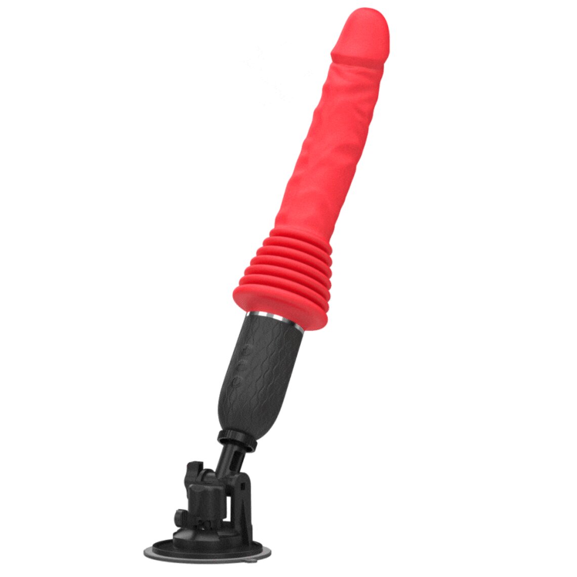 Red vibrator with forward and backward thrusting motion that simulates penetration. Includes a heat mode.