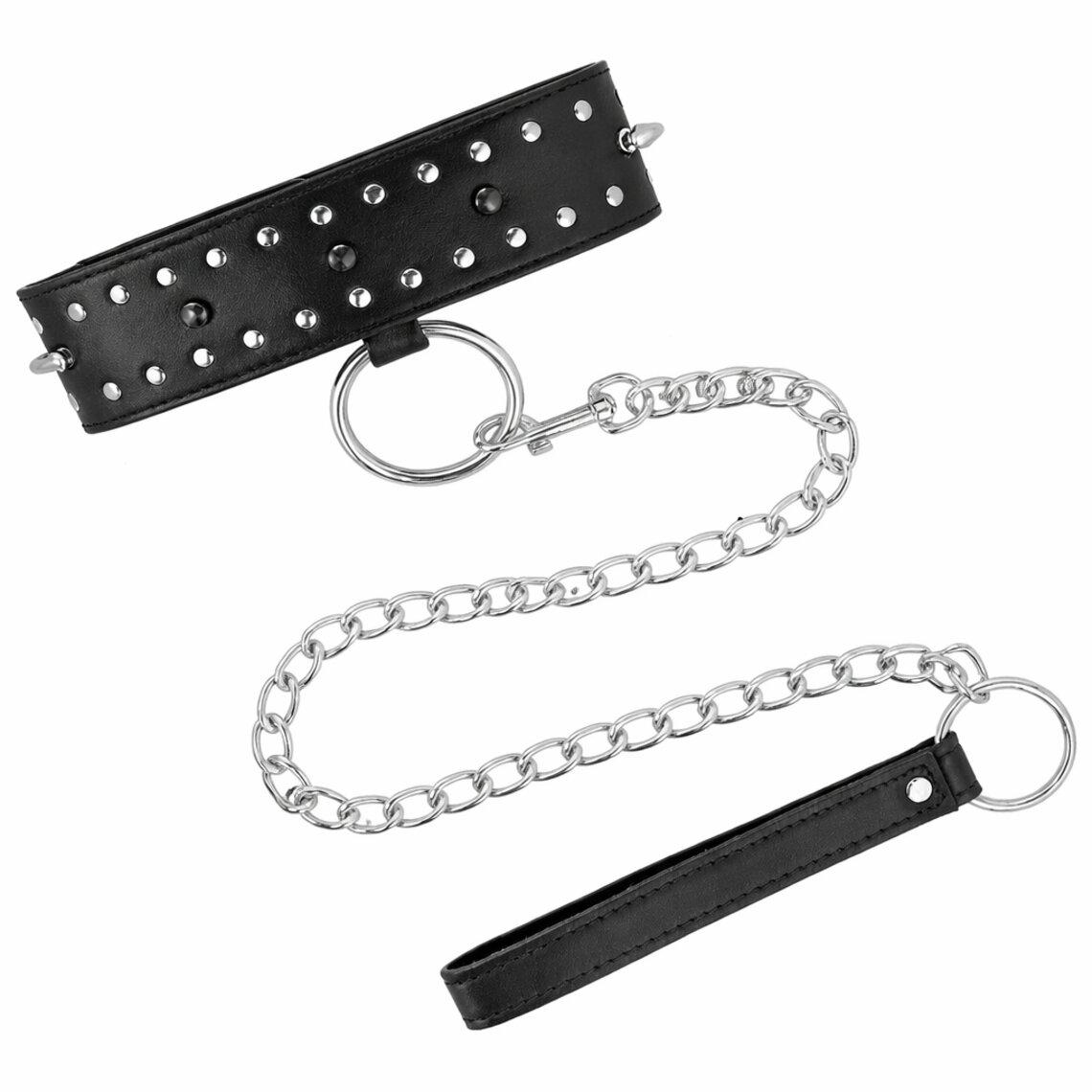Bondage collar with decorative studs and a 65 cm leash. Adjustable collar size 36–43 cm x 5 cm.