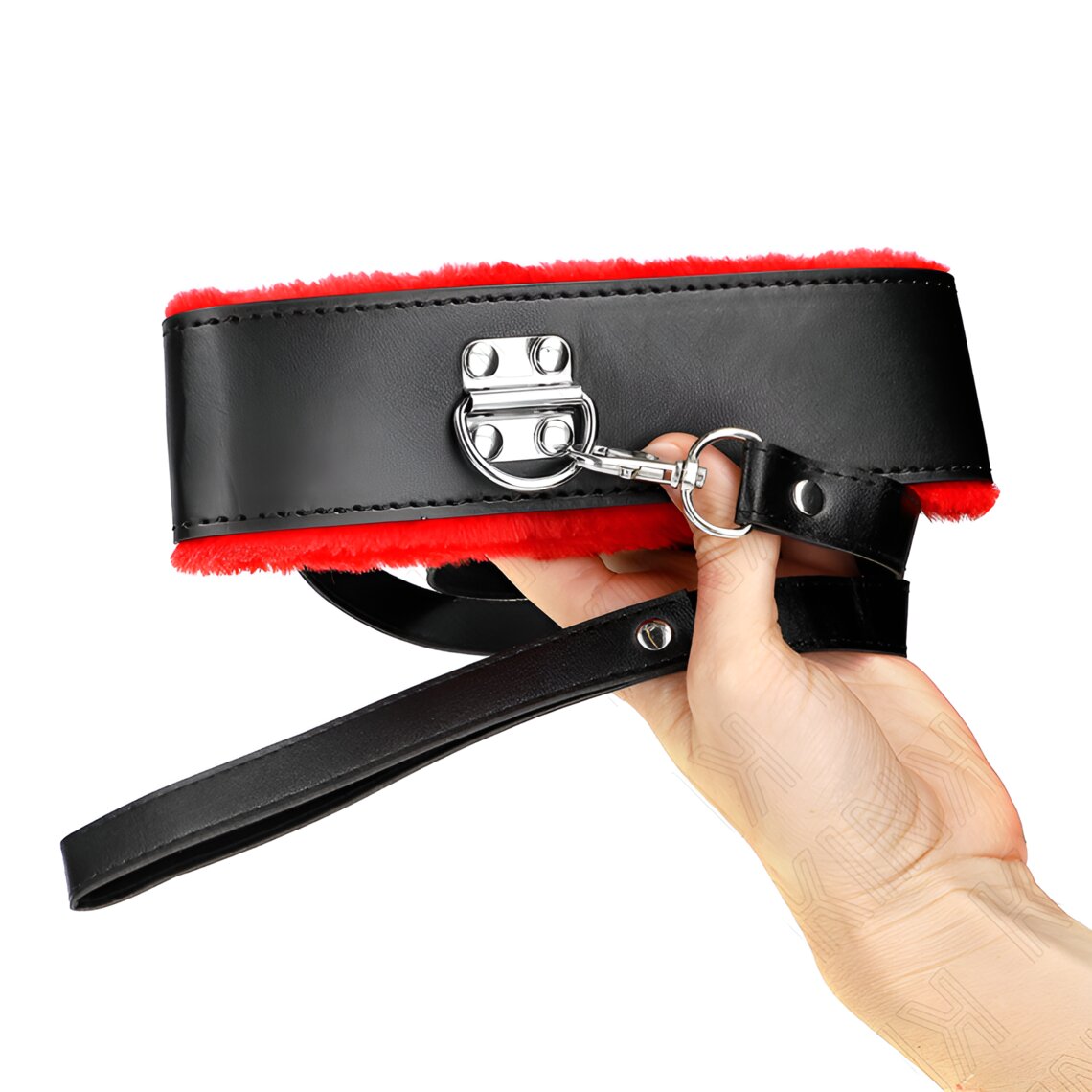Collar with leash designed to combine style, comfort, and durability. Its wide padded structure provides a soft feel against the skin, while the contrast between the black exterior and the red interior creates a striking and elegant aesthetic.
