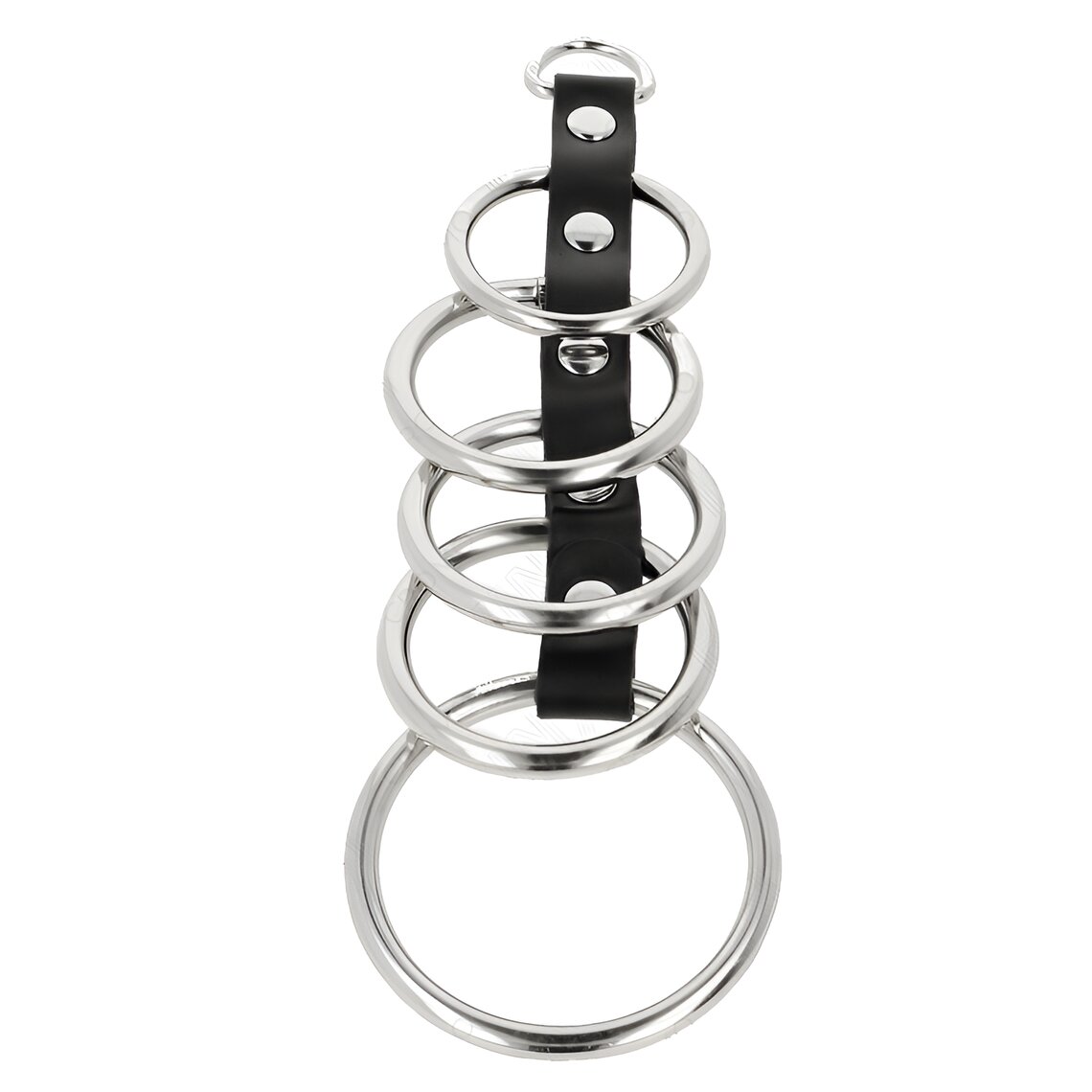 Five metal penis rings connected by a faux leather strip