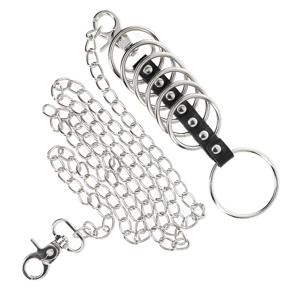 Seven metal penis rings with faux leather connector and 100 cm chain