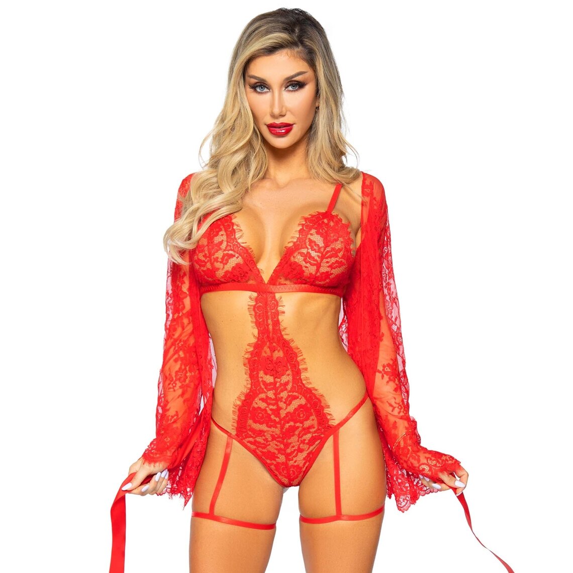 Leg Avenue All Romance - Open Red Lace Bodysuit with Robe