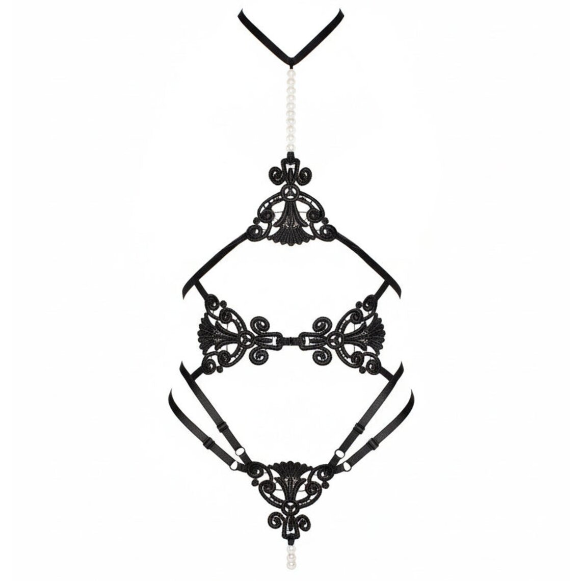Erotic black strappy bodysuit with lace details and decorative pearls.