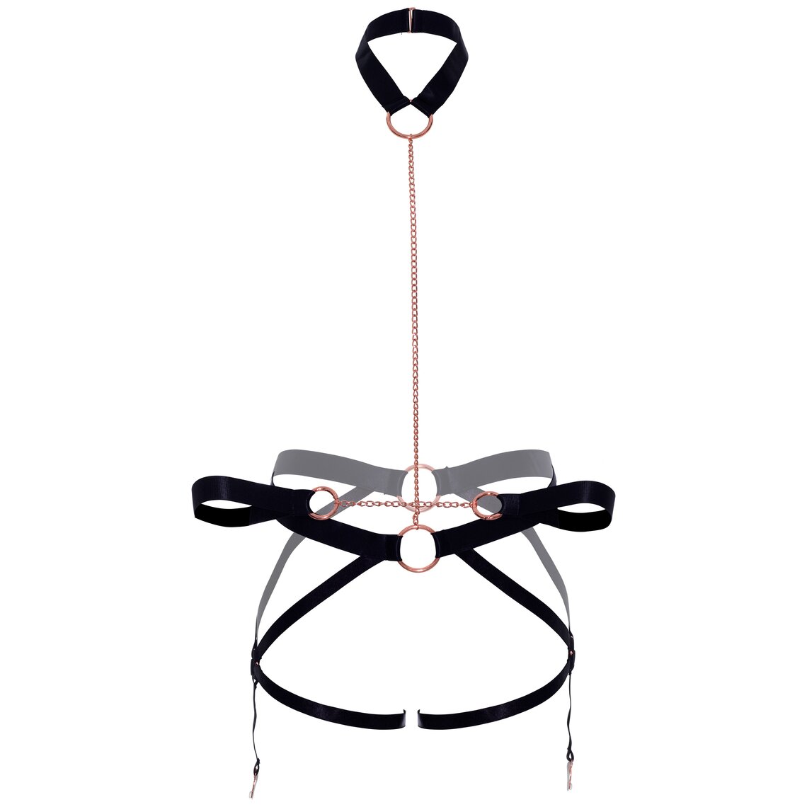 Erotic harness set with torso chain and neck choker.