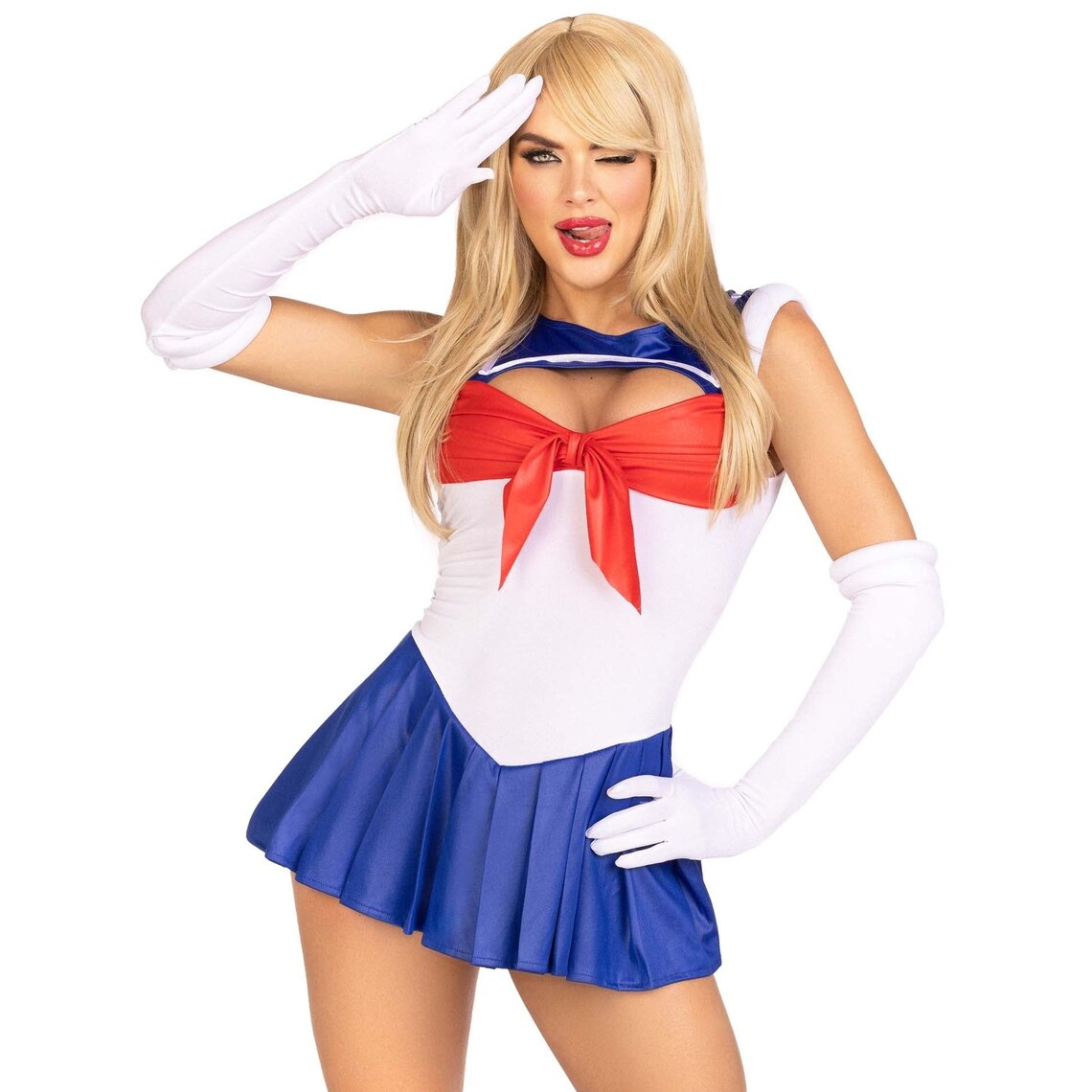 Unleash your inner cartoon diva with this pop culture-inspired 3-piece Sexy Sailor set! Ideal for Halloween or carnival, this saucy snap-closure bodysuit is highlighted by a flirty cut-out bodice and playful pleated skirt.