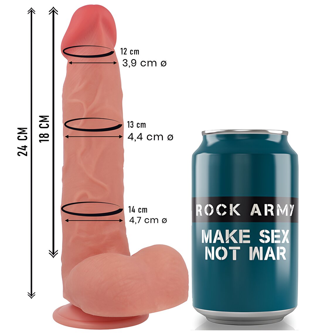 Premium realistic penis measuring 24 cm in length (18 cm insertable), with testicles and suction cup.