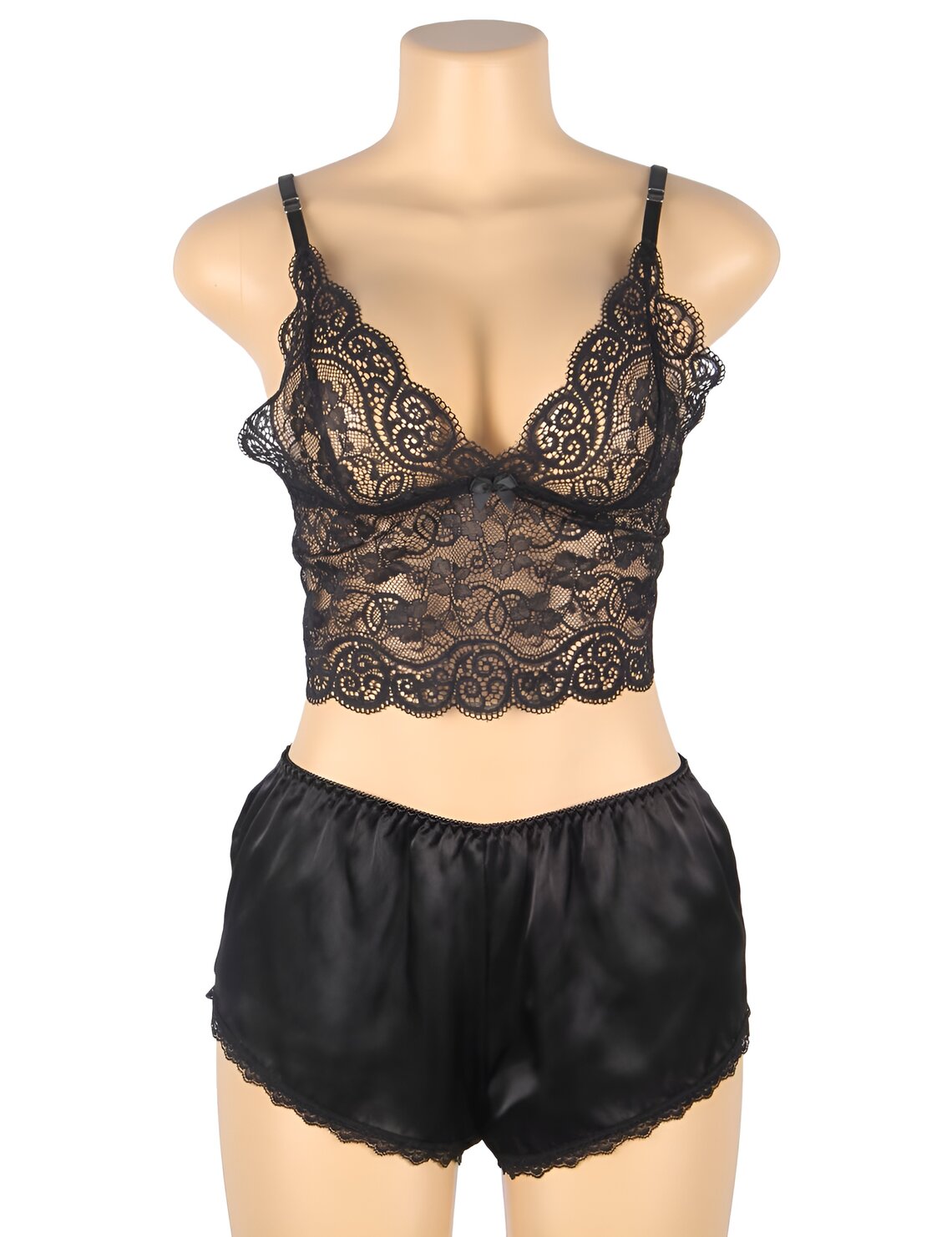 Lingerie set with lace top, thong and satin shorts