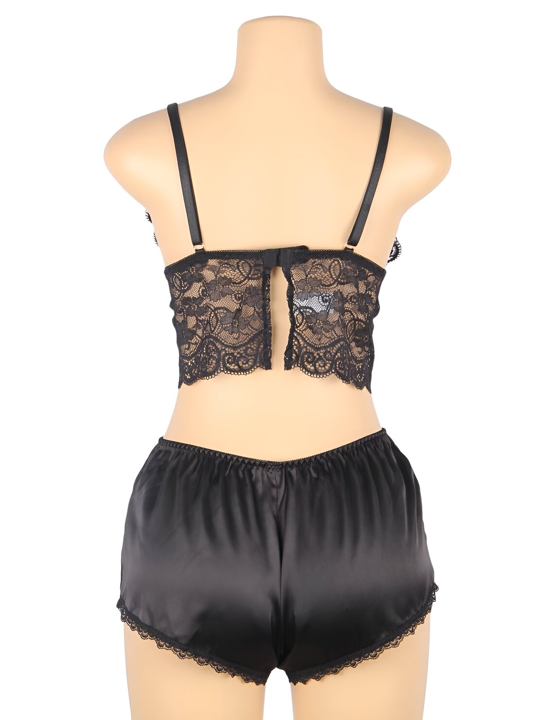 The bottom consists of a matching lace thong, continuing the same elegant and feminine design, along with a soft satin short that adds fluidity and a refined contrast to the set.