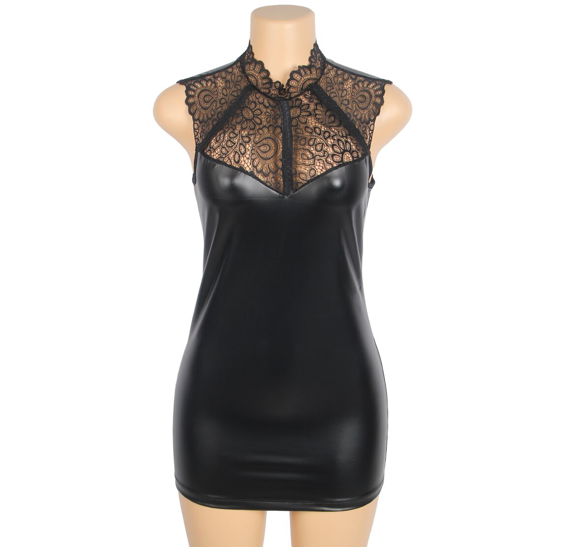 Bodycon dress with faux leather finish and high lace collar