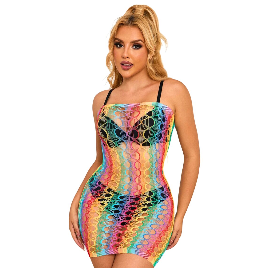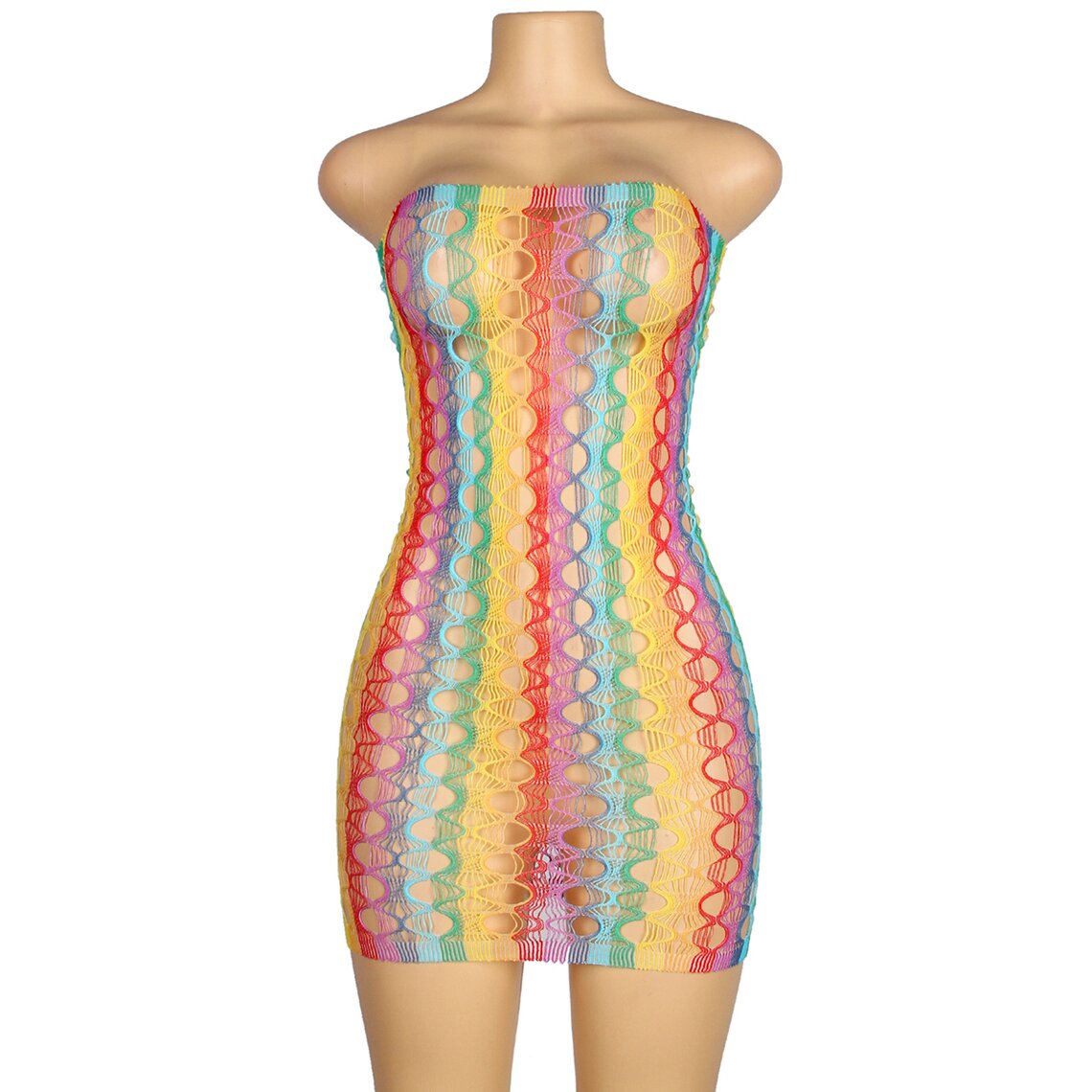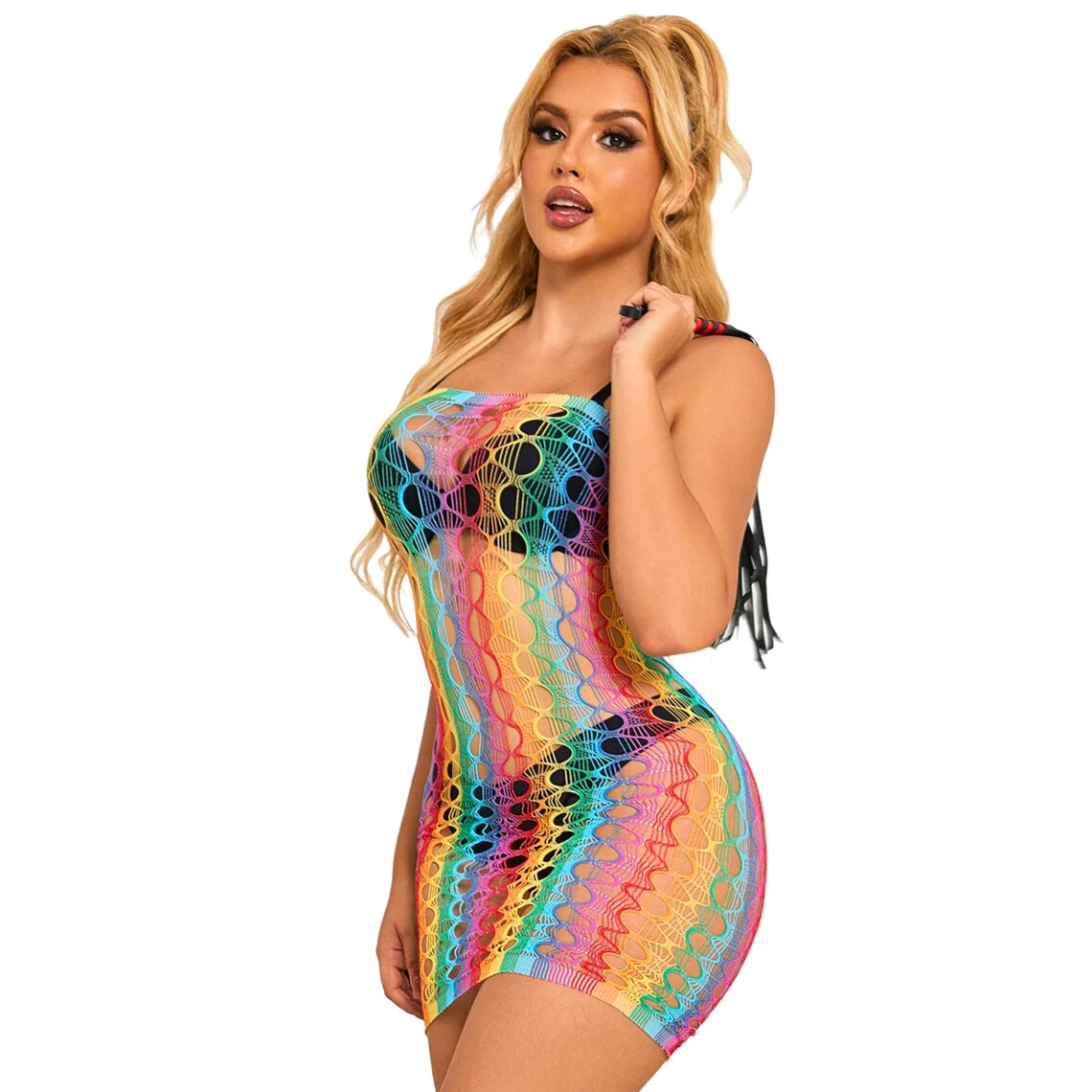 Sexy multicolor dress featuring a wide fishnet design. One size, stretchy fabric.