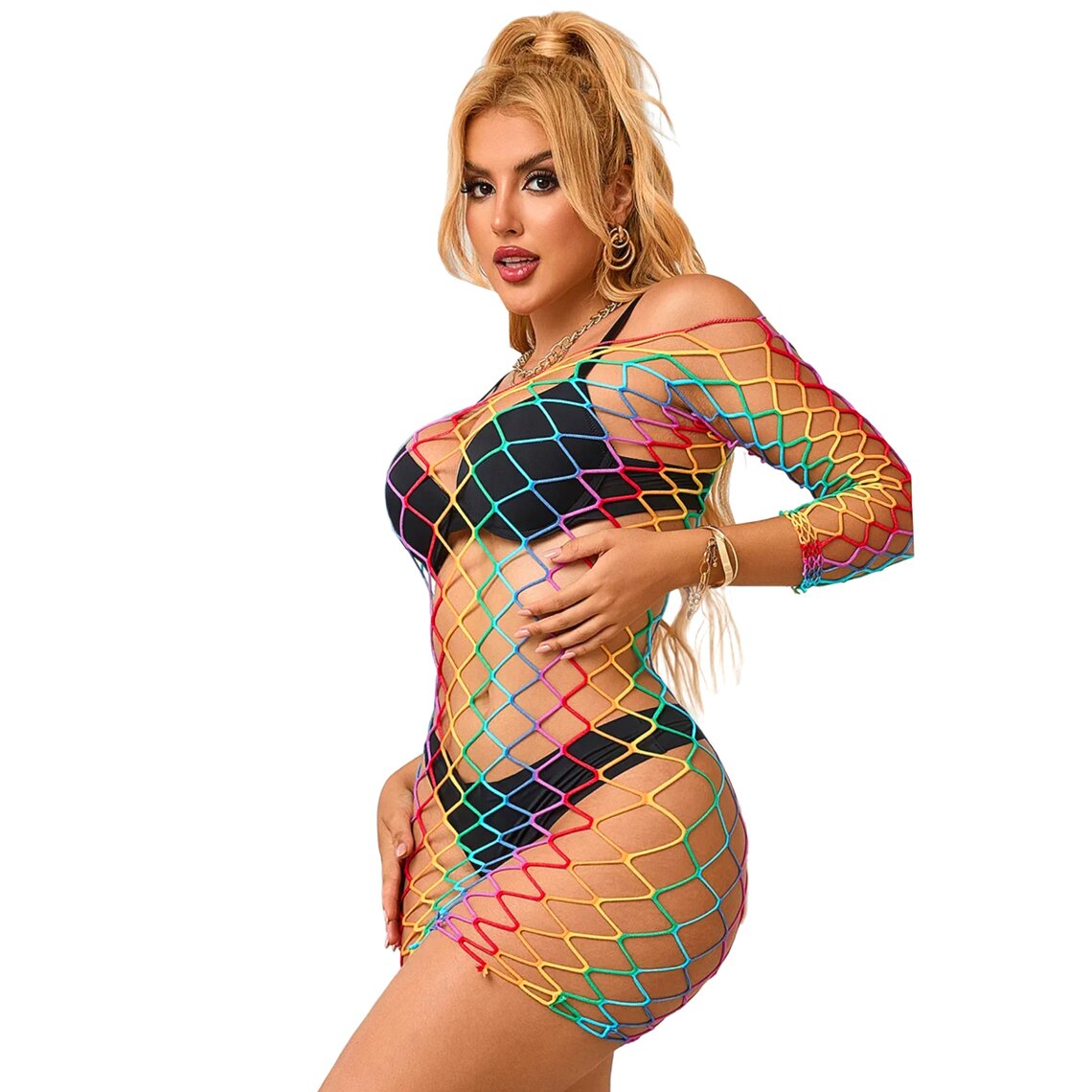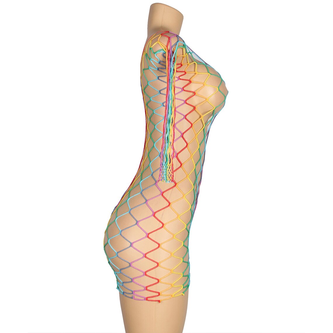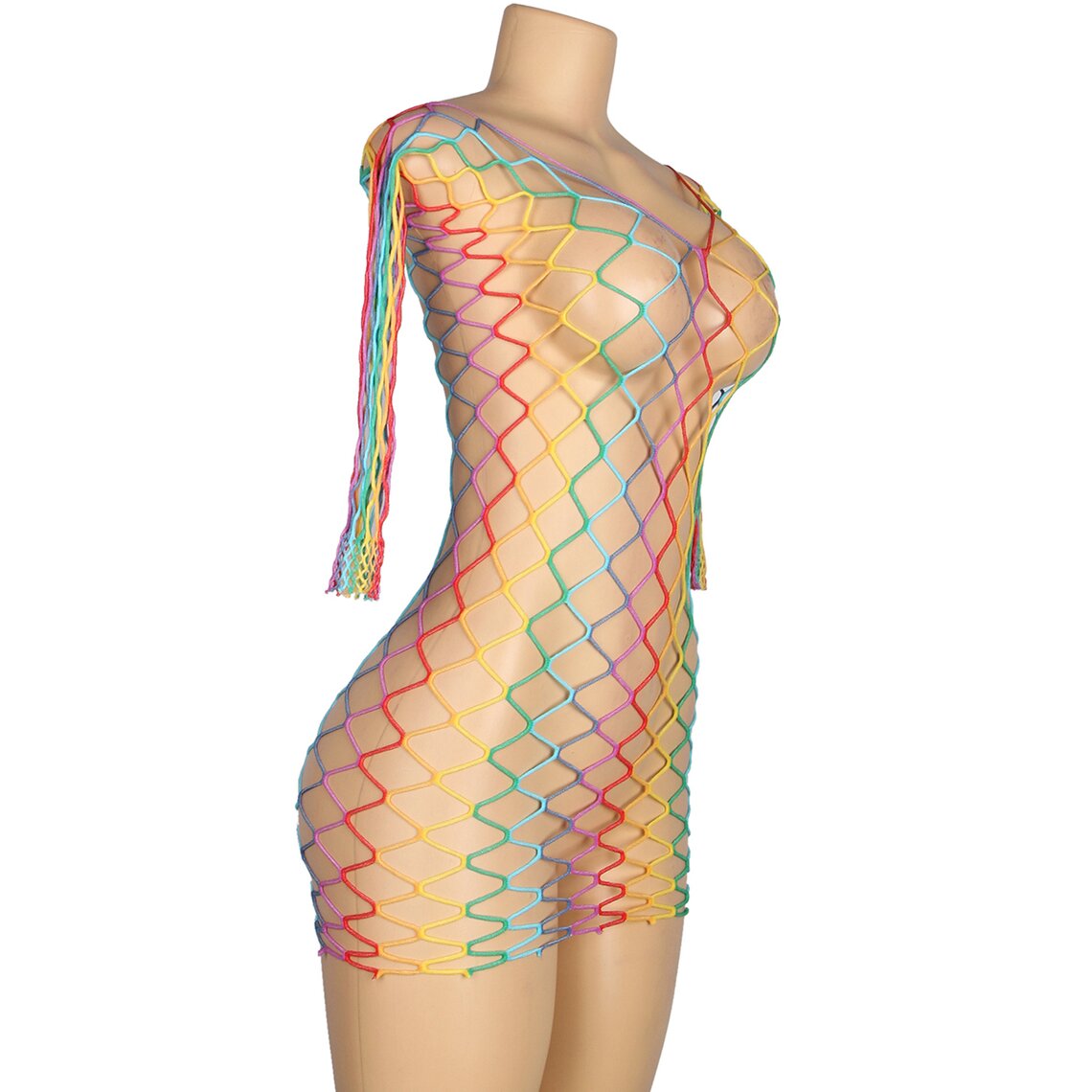 Sexy multicolor dress with long sleeves and wide fishnet design. One size, stretchy fabric.