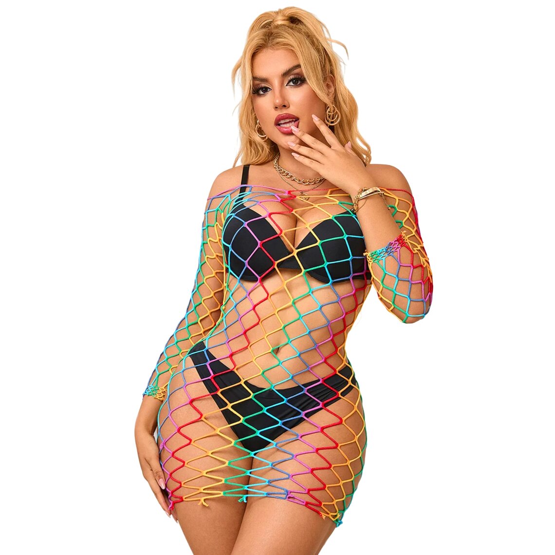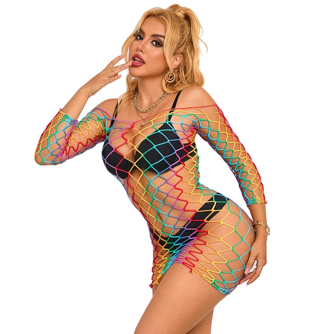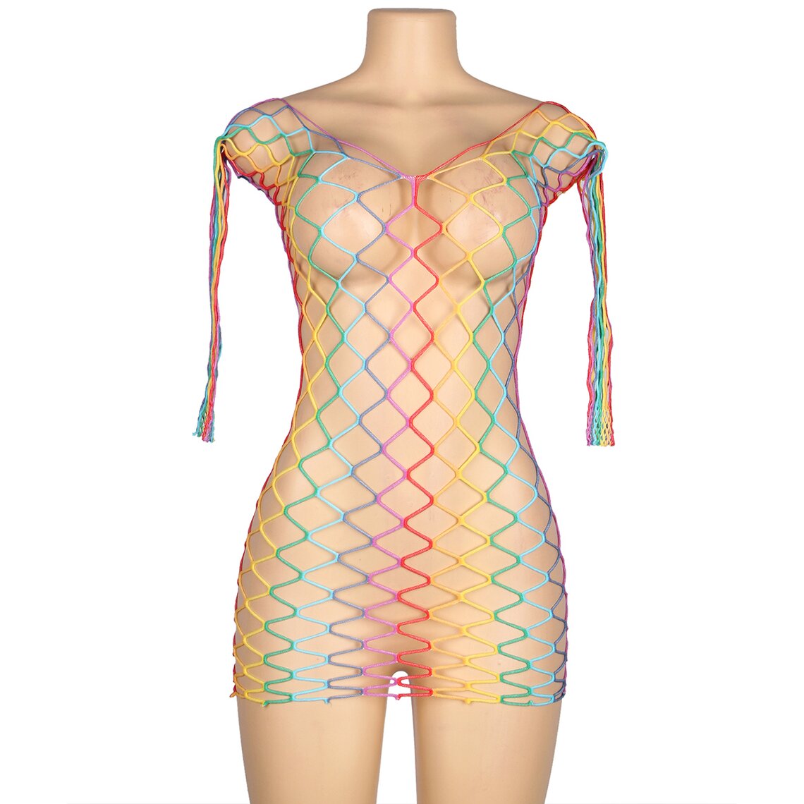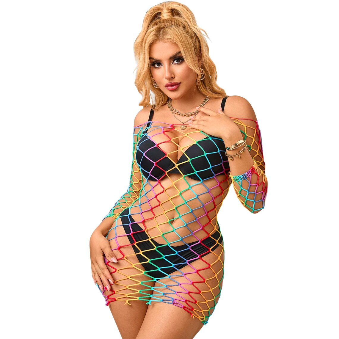 Sexy multicolor dress with long sleeves and wide fishnet design. One size, stretchy fabric.