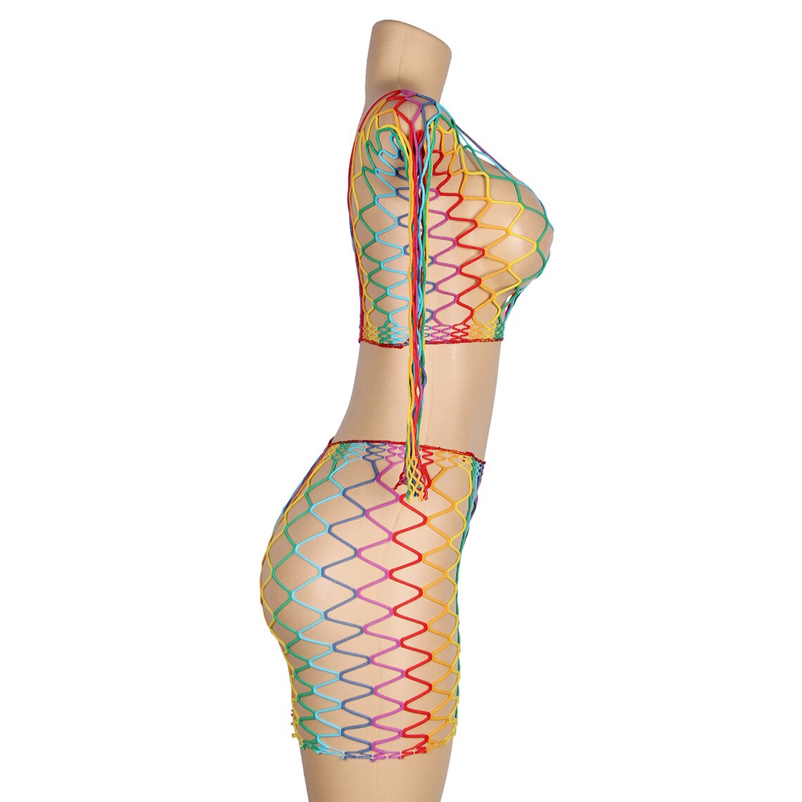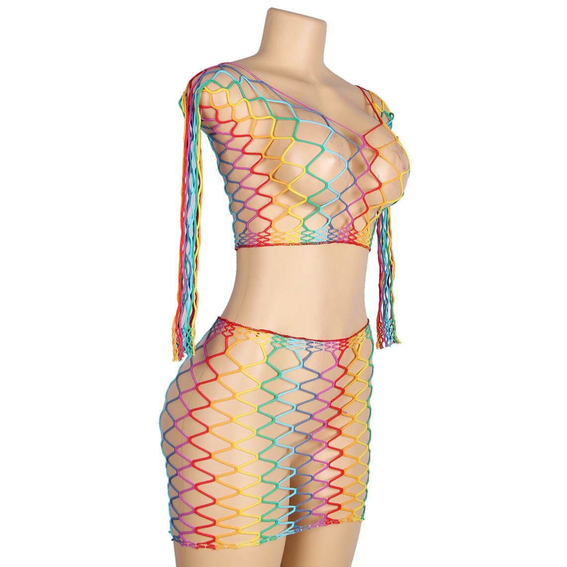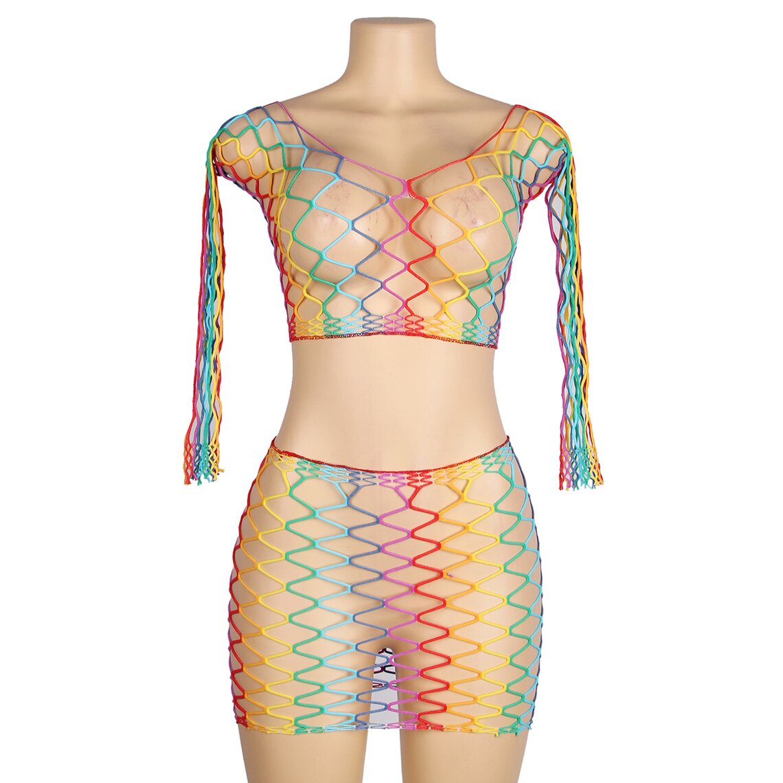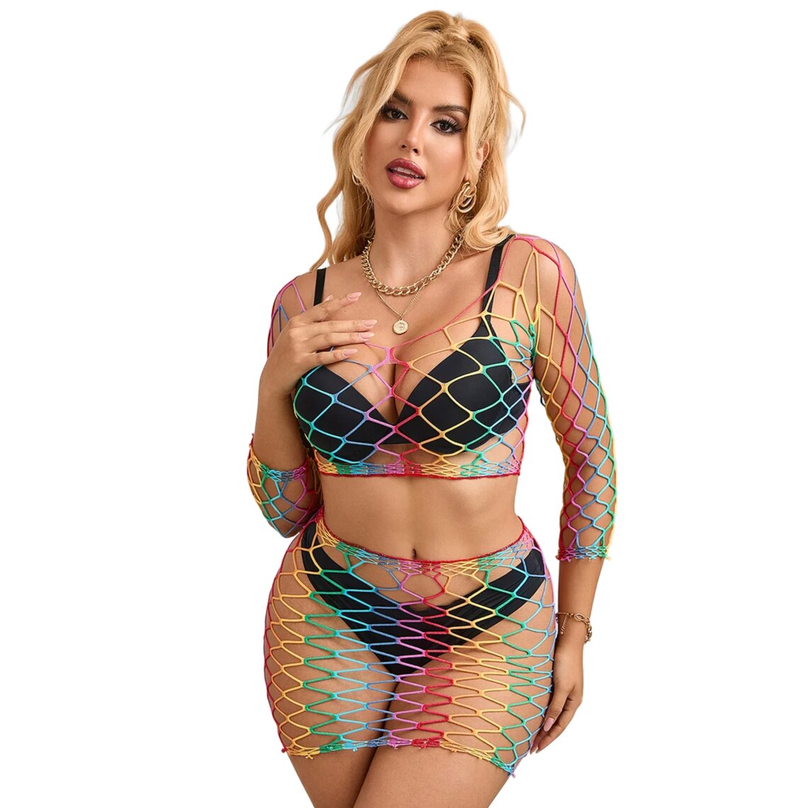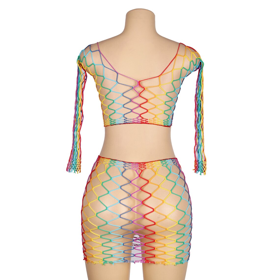 Sexy lingerie set featuring multicolor fishnet fabric and long sleeves.